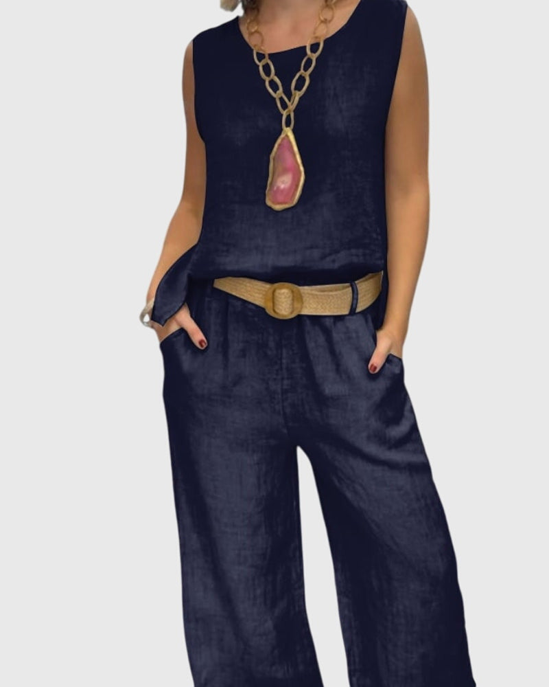 Effortless Chic: This two-piece set features a sleeveless top and wide-leg pants for an effortlessly stylish look.